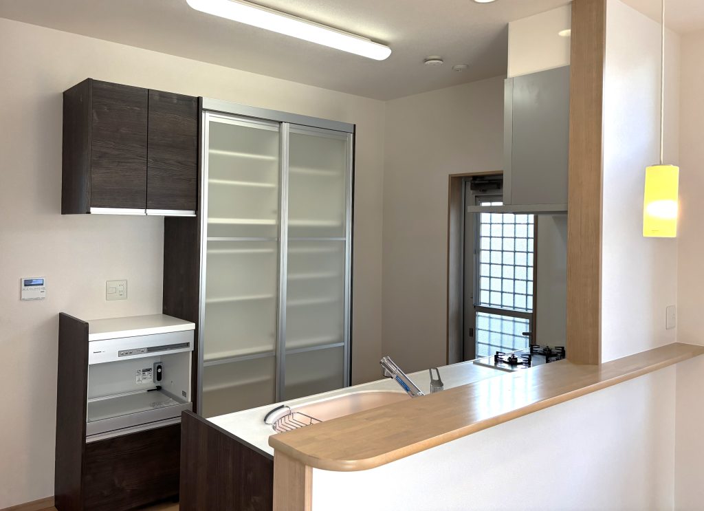 キッチン|トールタイプのカップボード付き。食器をたくさん収納できます。