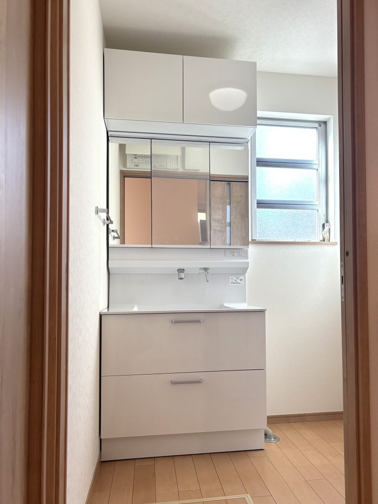 洗面化粧台|W900タイプ。新品に取り替えています。タオルや洗剤等のストックを収納していただけます。