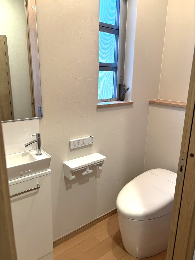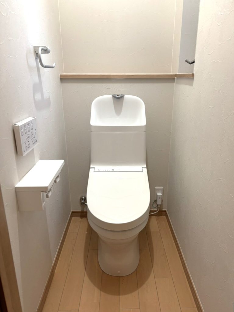 1Fトイレ|タンクレストイレ、手洗い器、紙巻器、リモコンを取り替えています。