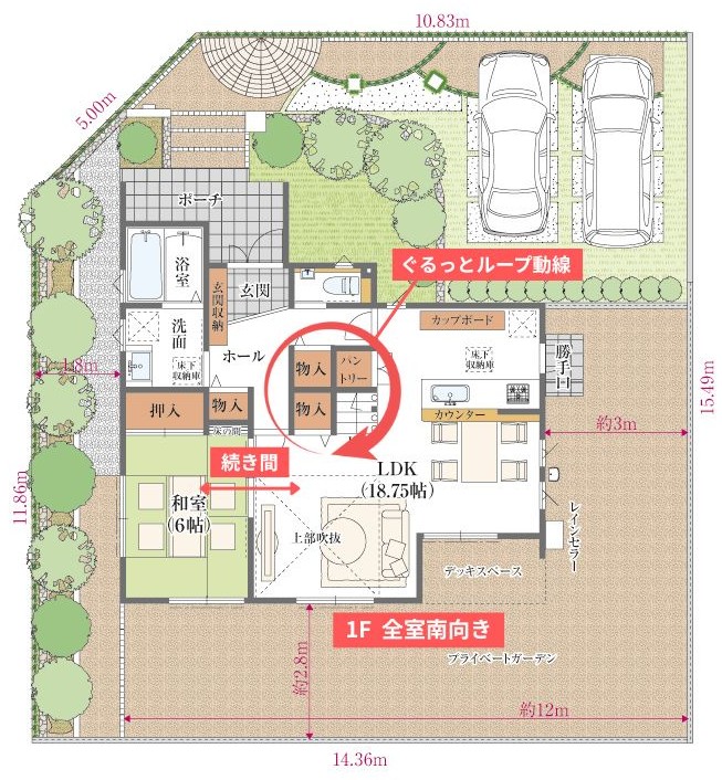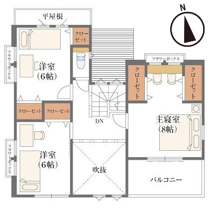 北西角地の物件です。弊社大規模分譲地内なので、歩道2m+道路6m、計8mあり、車の運転もしやすいです。