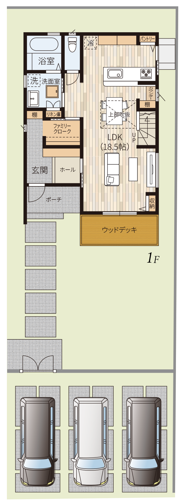 1階には、玄関から土間続きでアクセスできるファミリークロークを設置。帰宅後すぐに上着や靴を片付けられるので、玄関が散らかりません。さらにリビングにも直結しているので、生活動線もスムーズ。2階にも大きなファミリークロークを備えており、家族みんなの衣類や持ち物を効率的に収納し、居住空間を広く快適に保つことができます。